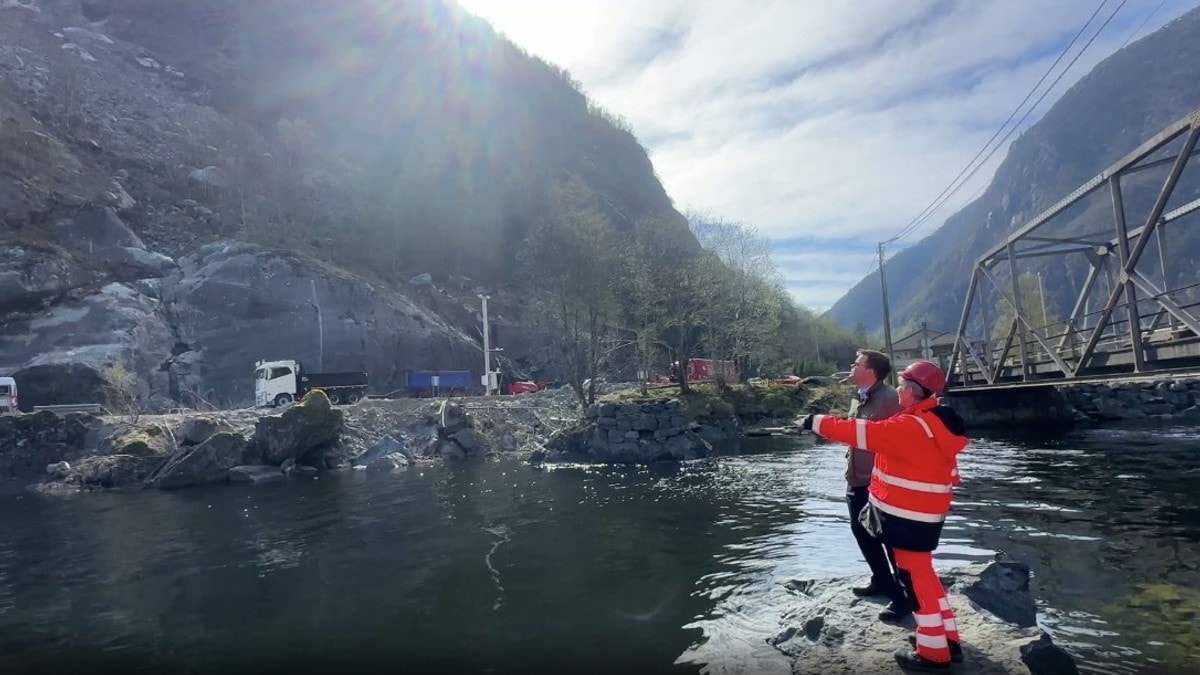 Arbeidet med å rydde opp og sikre E134 ved Fjæra i Etne etter raset som gikk 1. mars i år, er i rute. Planen er å åpne veien helt igjen til sommerferien. I dag er det kolonnekjøring forbi rasstedet. I dag var statssekretær i Samferdselsdepartementet Jakob Vorren på befaring for å se hvordan det går med arbeidet. – Dette er ikke planlagt arbeid. Dermed er det alltid en viss usikkerhet om vi klarer å få tak i utstyret vi trenger i tide. Men foreløpig ser det ut som vi skal klare det, sier avdelingsdirektør for drift og vedlikehold i Statens vegvesen Svenn Egil Finden. Det skal blant annet settes opp et 250 meter langt nett for å sikre mot ras. Dette er i tillegg til nettet på 60 meter som ble satt opp får dager etter raset gikk. Arbeidet med å rassikre og reparere veien er kostbart. – Vi regner med at dette koster minst 100 millioner kroner som vi må ta fra budsjettet vårt. Det kan få konsekvenser for andre veiprosjekt, sier Finden.